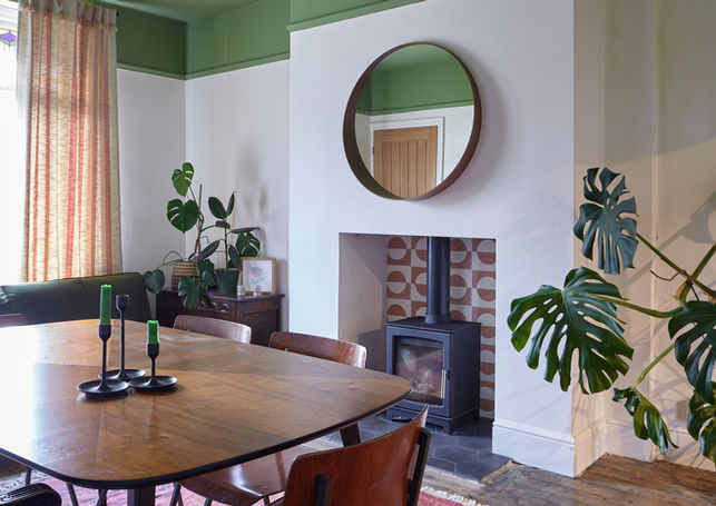 They hadn't thought of using the height of their ceiling to their advantage by painting it, creating a cosier feel to the room without sacrificing on the light feel of the pale walls. Pops of red and green, and some practical vintage dining furniture give this room lots of personality and homely vibes.